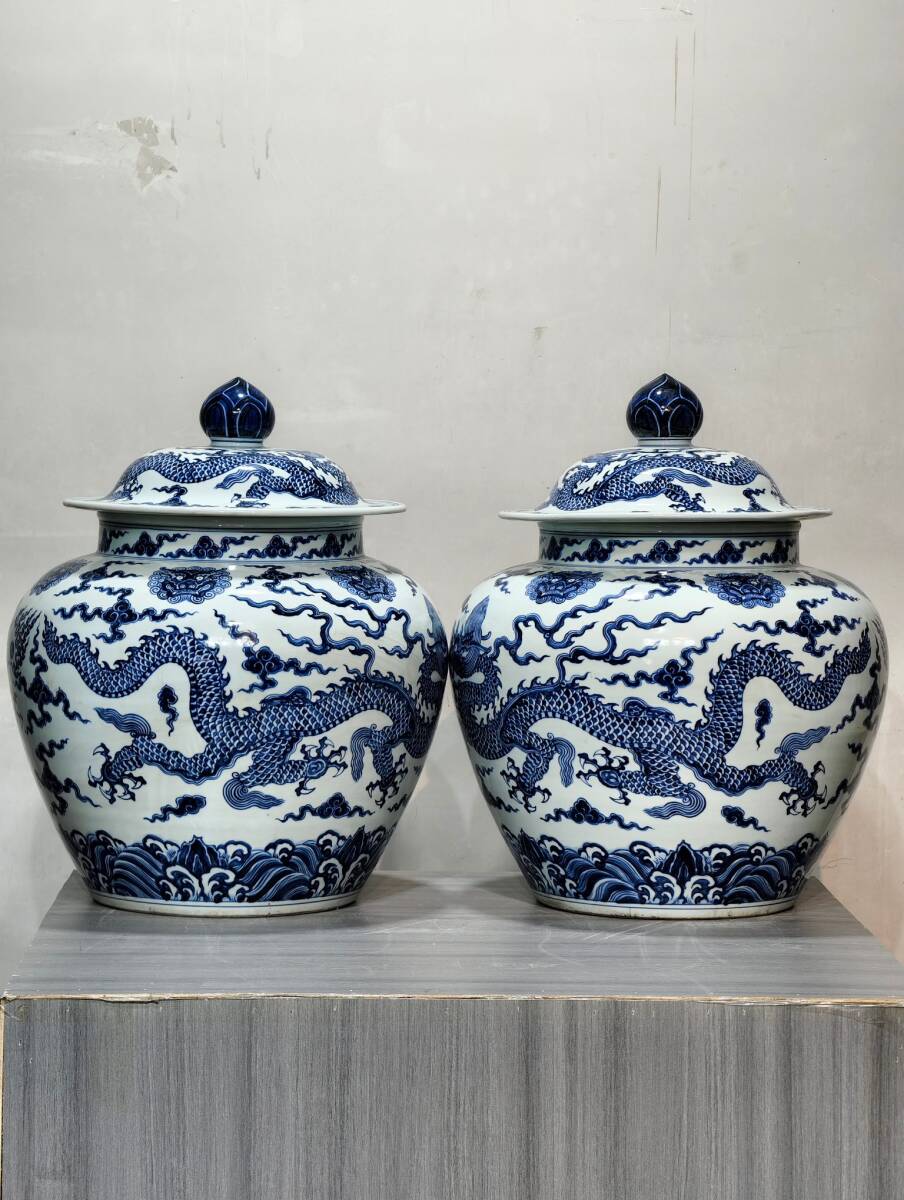 - 6+GV3386「東洋美術」 中国骨董 人間国宝 磁器製品【龍の模様が描かれた青と白の蓋付き壺のペア】 旧物 孤品 珍品 陶磁器 収蔵価値が高い