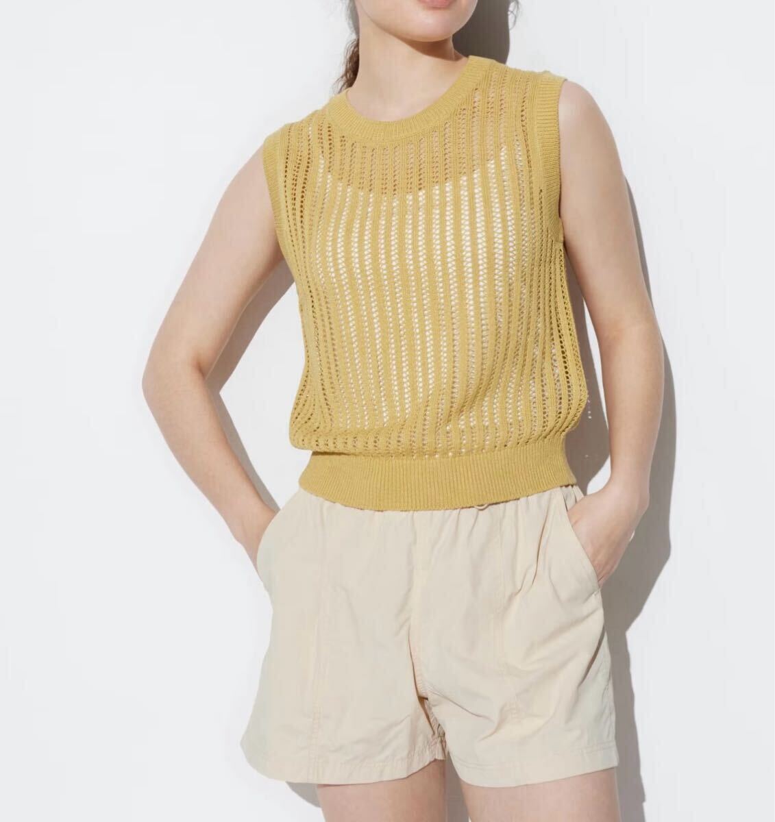 - ユニクロ メッシュクルーネックショート セーター/ノースリーブ M イエロー 黄色