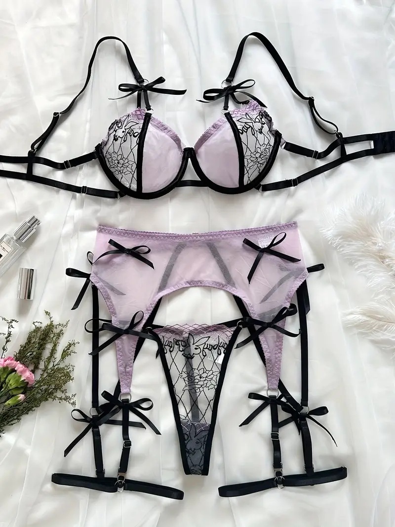 > ◆ ラグジュアリー 刺繍メッシュレース ブラジャー&ショーツ&ガーターベルト&ホルダー セットLL 新品:大きいサイズ◆送料230円(匿名)◆