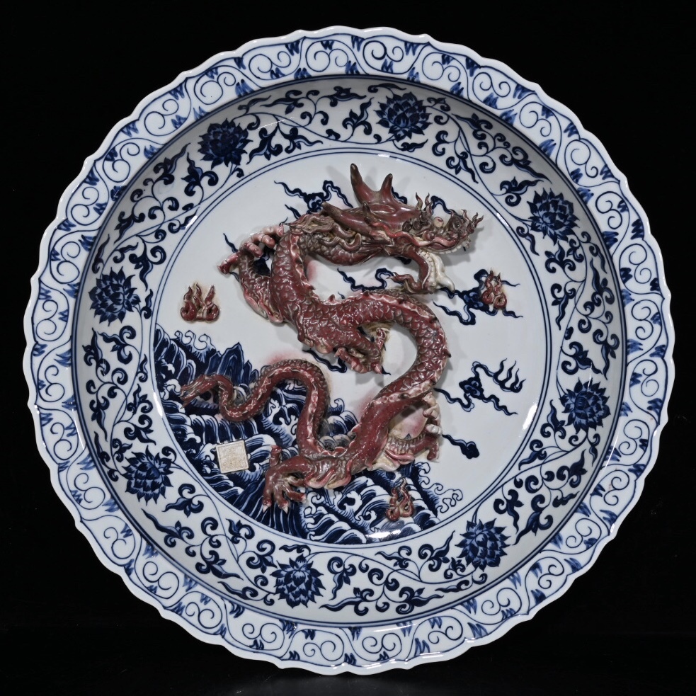 - 磁器 秘藏 清代 乾隆年制 青と白の纏枝蓮釉に赤の立体彫刻龍紋皿 酒器 茶器 唐磁 染付 陶磁器 收蔵品 古美味 時代物 古置物 中國文玩
