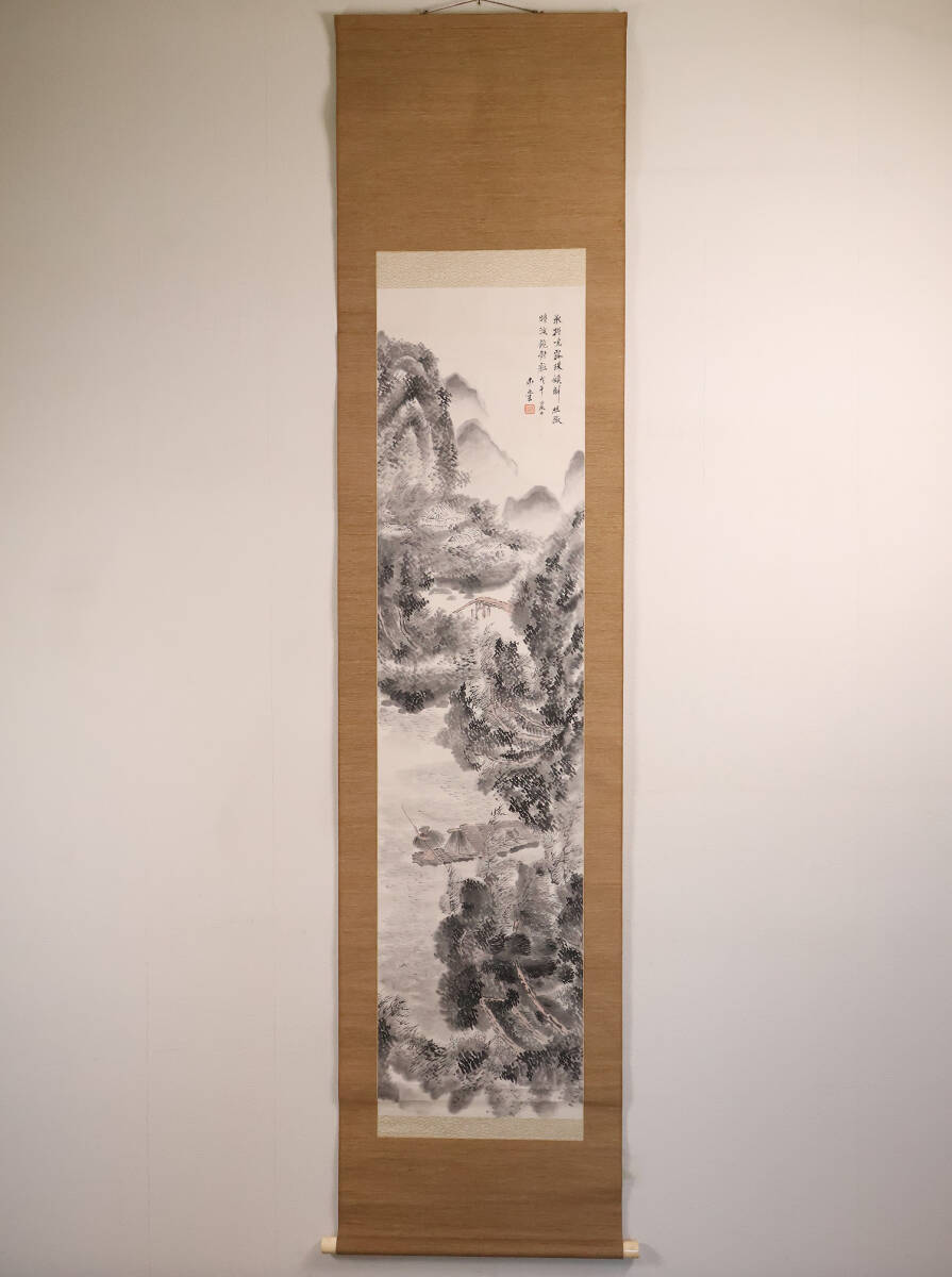 - 【模写】日本画 山田介堂「秋湖泛舟図」紙本 掛け軸 宏堂識箱 明治大正 山水遊舟 福井県の画家 富岡鉄斎に師事 MA709