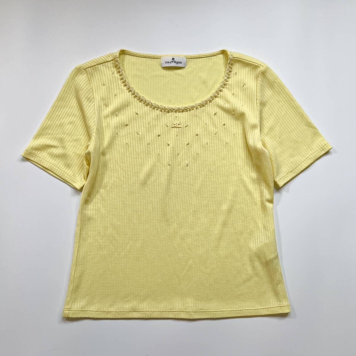 > courreges 半袖 カットソー トップス 40 L 黄色 刺繍ロゴ ビーズ装飾 華やか きれいめ ストレッチ 夏 サラサラ イトキン クレージュ〇680y