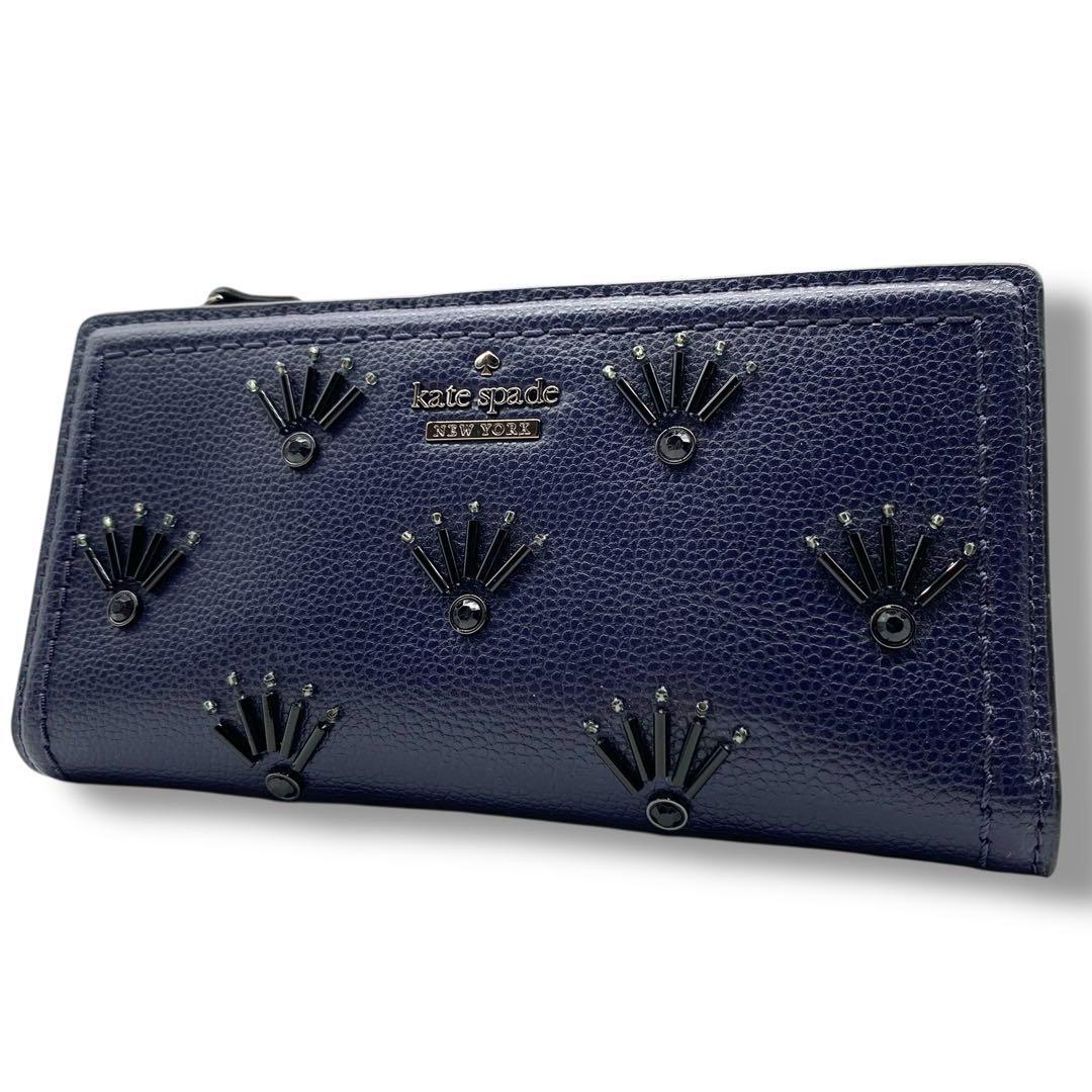 - 未使用級! ケイトスペードニューヨーク 折りたたみ 長財布 総柄 ネイビー