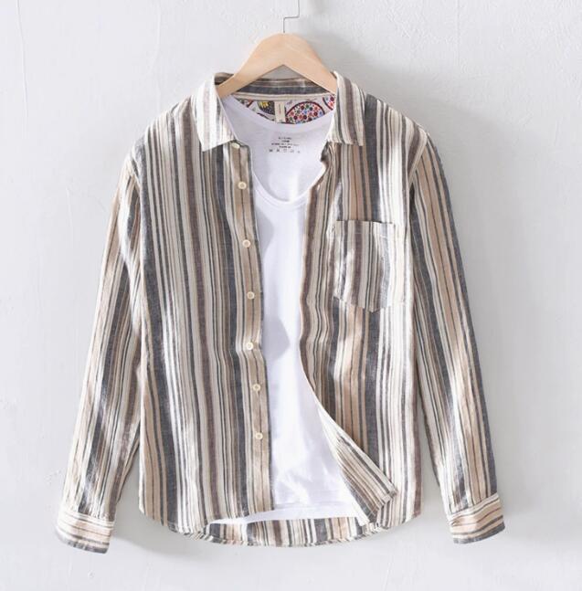 - 大人気メンズ 長袖シャツ 麻100% リネンシャツ 春夏 ヴィンテージ 花柄 サマー 超希少 心地良し ストライプ柄 スリム 細身 灰L