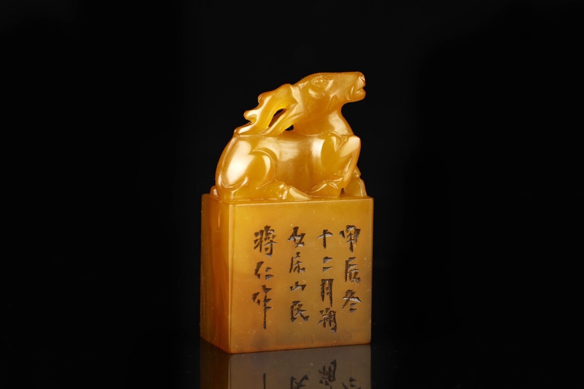- 「清 蒋仁作 老寿山石 田黄石彫り 穆如清風 鹿鈕印章」極細工 擺件 古賞物 中国古美術 旧蔵出