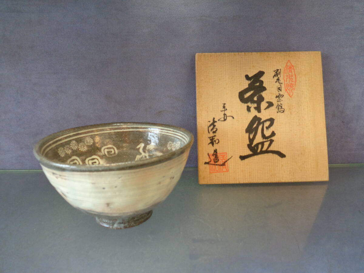 > お茶道具 抹茶茶碗 京焼 清水焼 平安 清和造(原清和) 刷毛目雲鶴茶碗 共箱入り