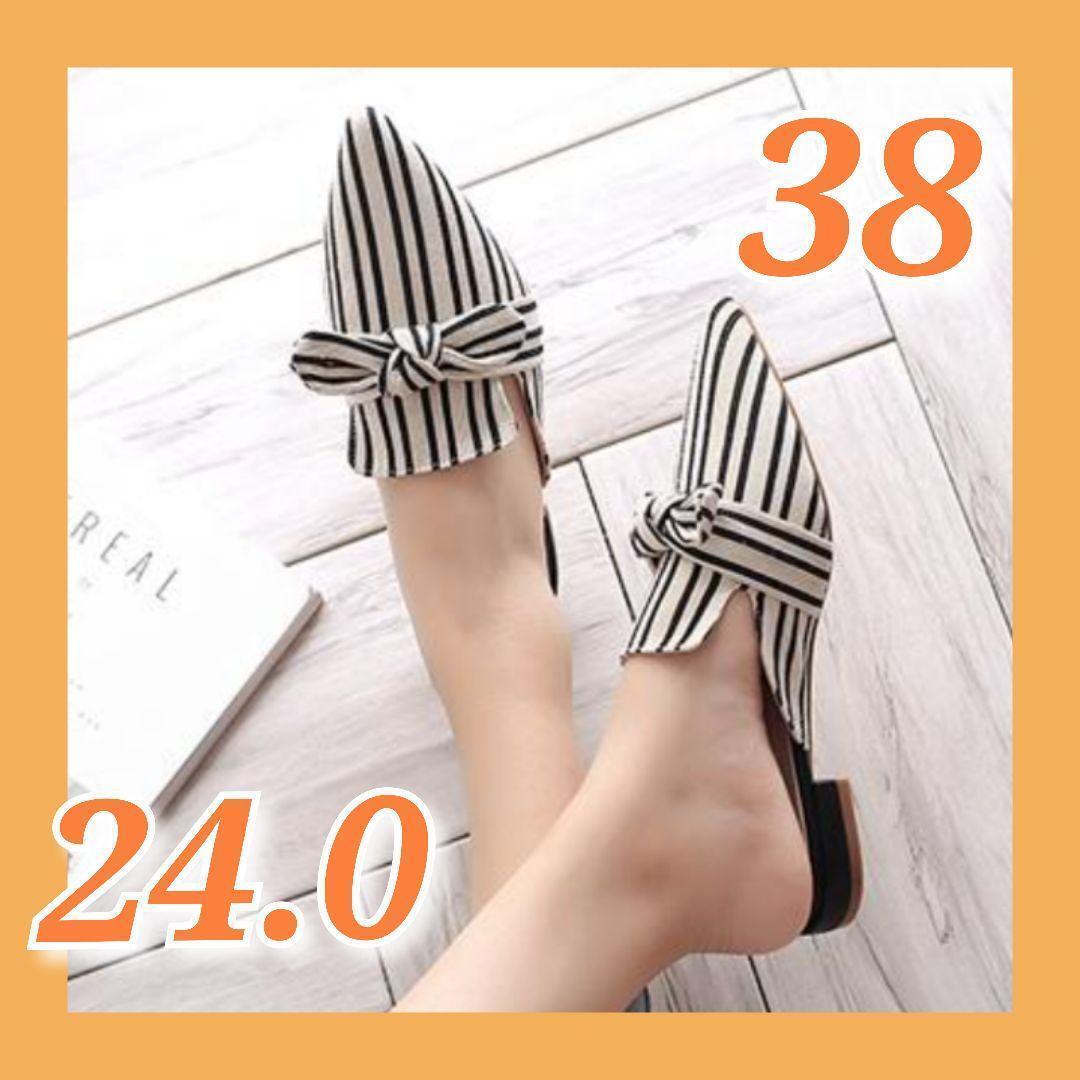- ミュール サンダル レディース ヒール リボン付き ローヒール 太ヒール 幅広 黒 サボ スリッパ ポインテッドトゥ 美脚パンプス 24.0