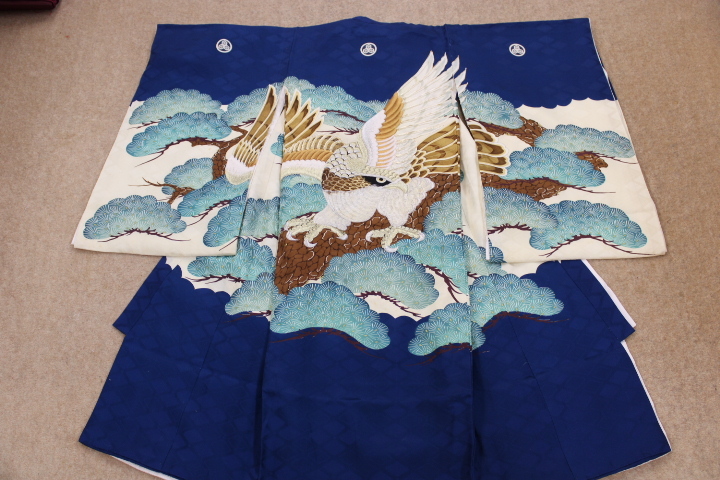 - きもの今昔8714 子供のきもの 男児一つ身紋付きものと白下着付き 正絹綸子地松に鷹の柄(鷹は刺繍)