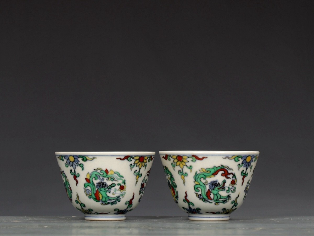- 「明 成化年製 陶磁器 鬥彩団龍紋 杯一対」染付 置物 擺件 古賞物 中国古美術 旧蔵出