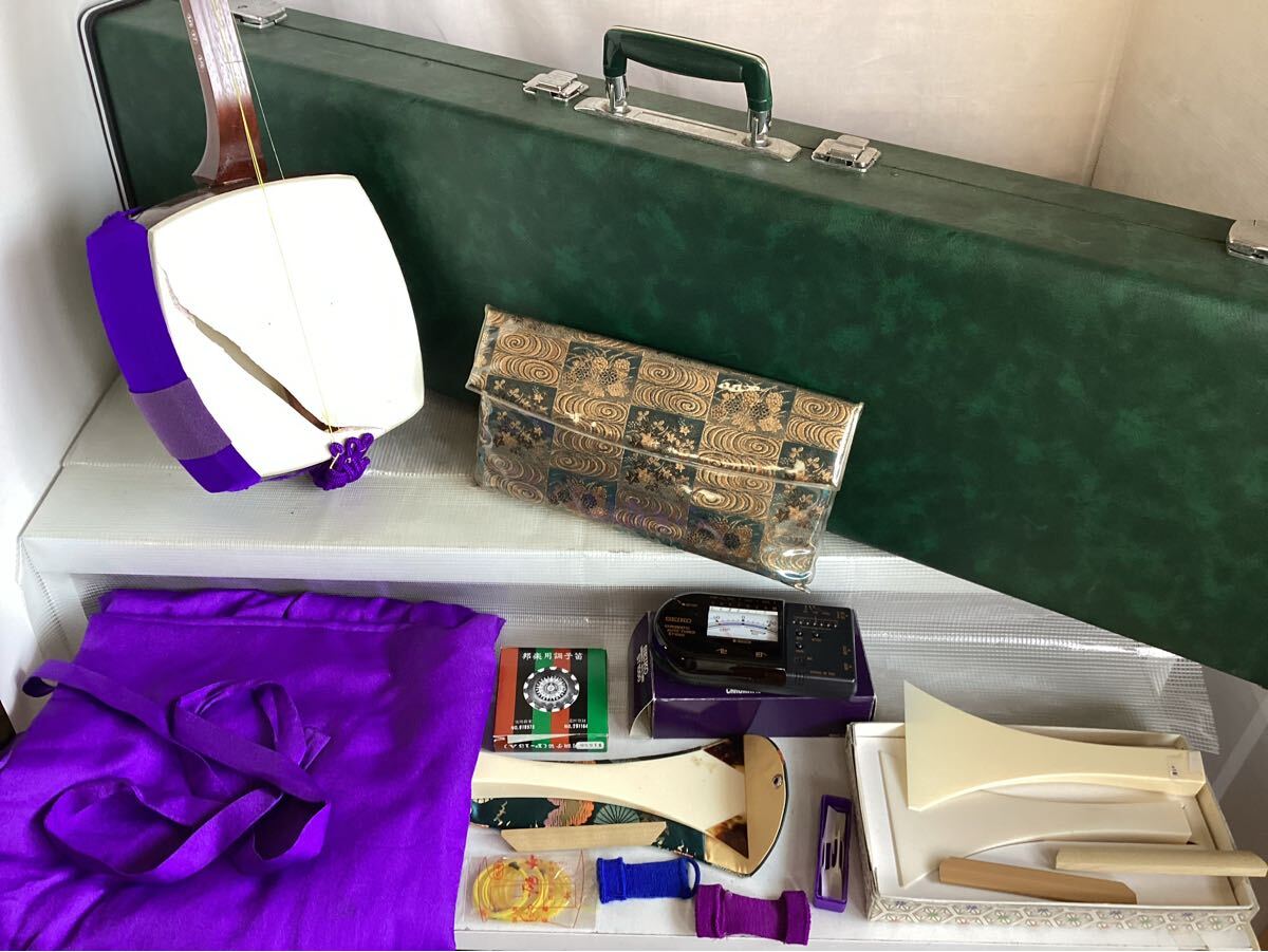 - 【K0488】 三味線 和楽器 ハードケース付 バチ 3本 調子笛 オートチューナー 三絃糸他