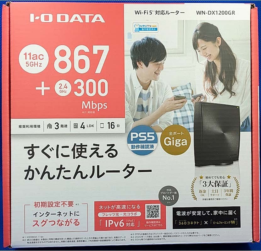 > 【ほぼ新品・ほぼ未使用 美品】I・O DATA Wi-Fi 5 対応ルーター WN-DX1200GR 867+300Mbps IPv6対応 無線lLAN親機
