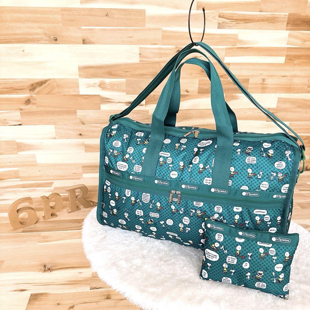 鮮やかなグリーンとマスタード系イエローの遊び心あるカラーリング。キャリーオン仕様やポーチ付きで、旅行やジムにもぴったりで、スヌーピーのコミカルなプリントが全面に散りばめられた楽しげなムードのある、とっても可愛いLeSportsac × SNOOPYコラボのボストンバッグです。既に完売、生産も終了しており、オークションやフリマでも見ることの少ない、たいへん珍しいお品です。