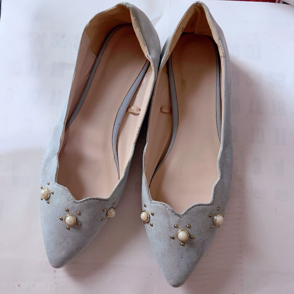 - 可愛い GU スカラップパンプス フラットシューズ パール 水色 ユニクロ バレエシューズ パンプス ビジュー