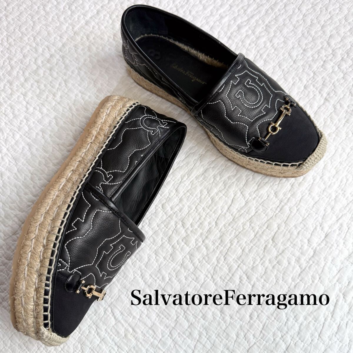 - 美品 SalvatoreFerragamo サルヴァトーレフェラガモ ガンチーニ エスパドリーユ 厚底 スニーカー スリッポン 7 1/2 C 24.5cm ブラック