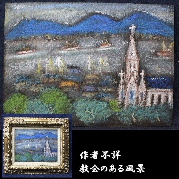 - 作者不詳 「教会のある風景」 パステル4号 額装/ガラス入 D970
