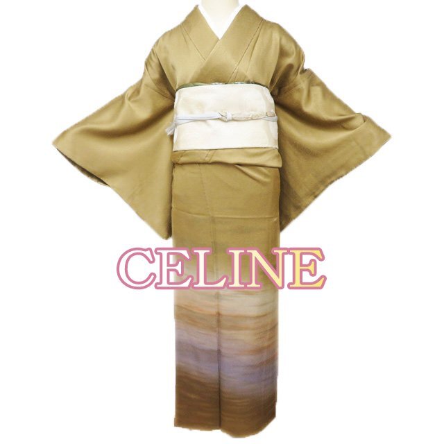 > 特選 付下げ 付け下げ 訪問着 着物 中古 正絹 袷 セリーヌ CELINE 落款 霞ぼかし 黄唐茶色 多色 身丈157cm 裄66cm M きもの北條 A1231-10