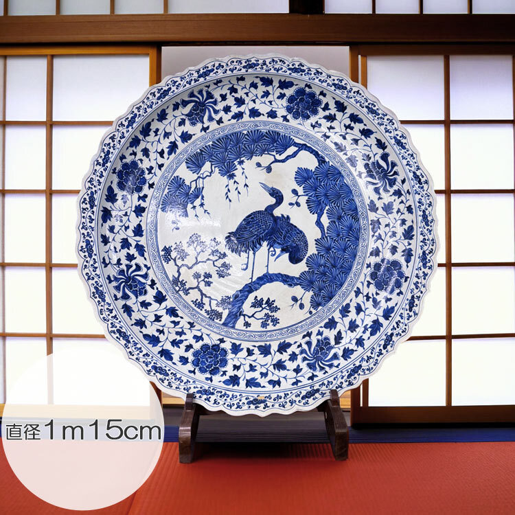 > 景徳鎮 青花 鳳凰文盤 特大皿 3.5尺 直径約1m13cm 皿 磁器 中国美術 大皿 白磁 オブジェ 工芸品 美術品 高級感 陶磁器 大迫力 装飾品 置物