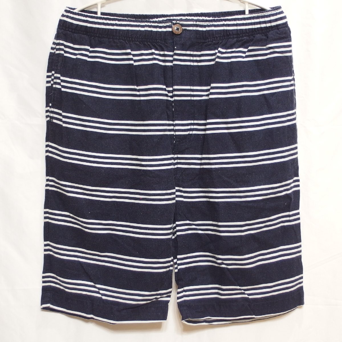 > LONG BEACH SURF STYLE◆ボーダー柄 麻混 ショートパンツ 短パン(ネイビー)XL ウェストゴム仕様◆USED E