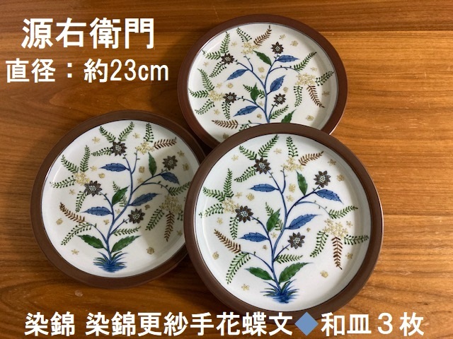 - 源右衛門★染錦 染錦更紗手花蝶文★中皿/大皿★3枚セット/3客★古美術 骨董 和食器 館林源右衛門