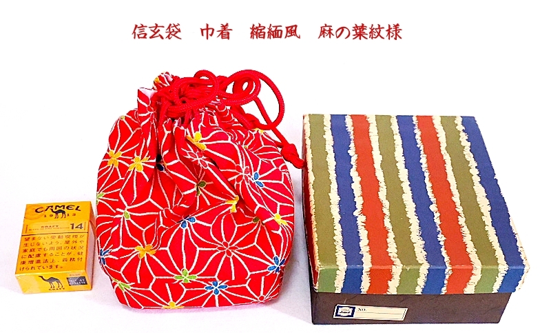 - 信玄袋 巾着 縮緬風 麻の葉紋様 USED