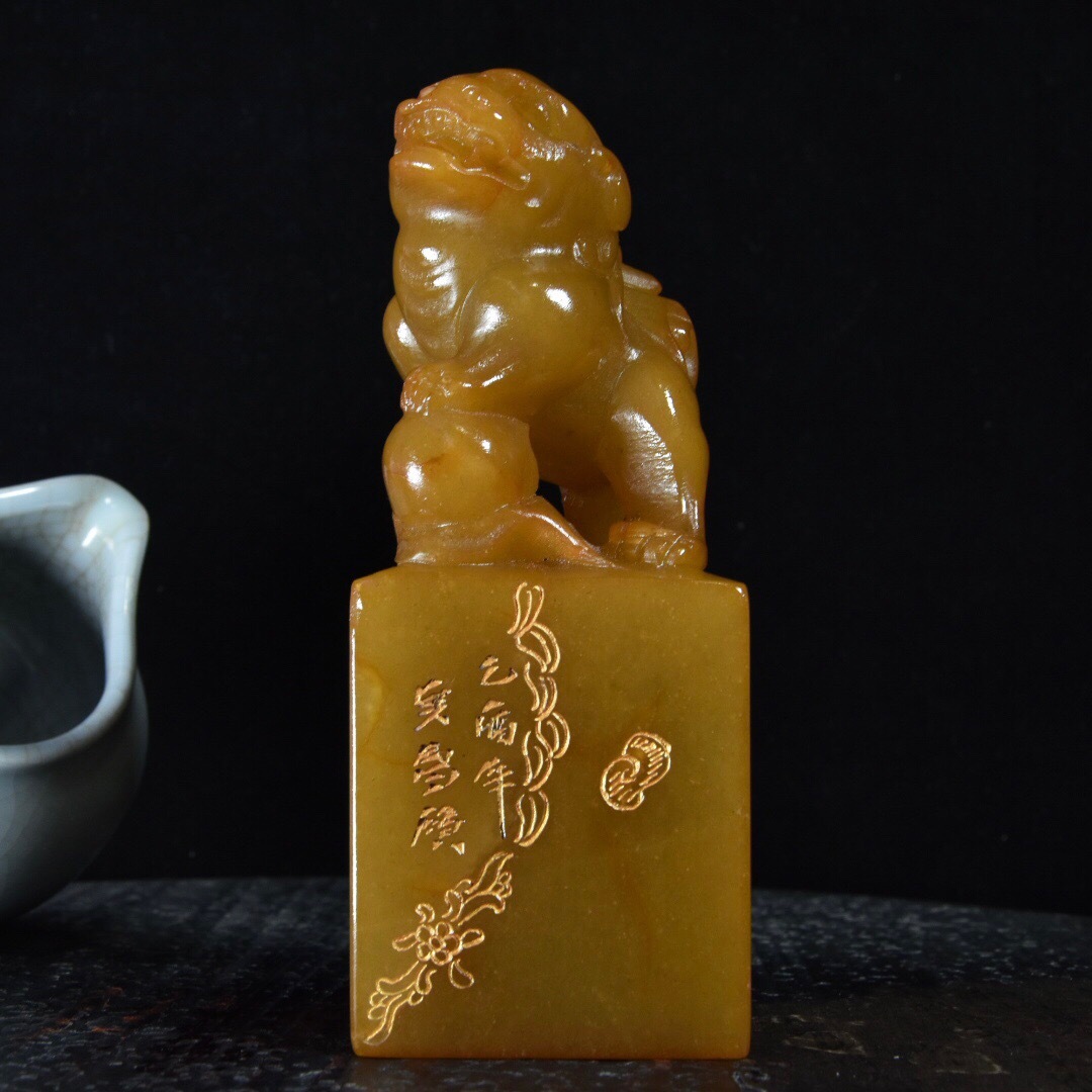 - 蔵友旧蔵出 寿山石 田黄石 細密彫 描金 瑞獣印章 箱付 貴重品 稀少物品 置物 賞物 中国時代美術品