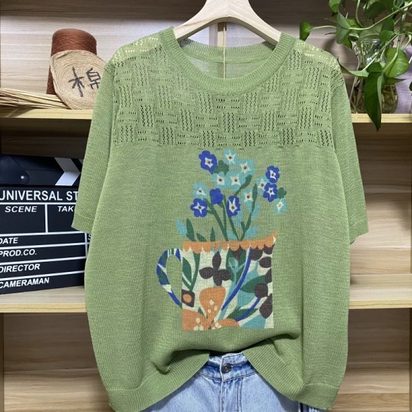 - 25zy サマーニット レディース トップス 高質 ラフ 麻タッチニット チュニック ナチュラル 麻混 サラサラ 涼感 Tシャツ プリント花柄2