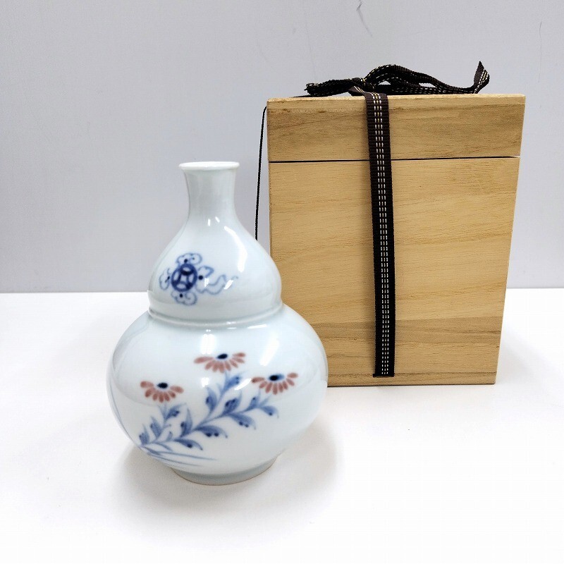 - 韓国人間文化財 『安 東五』作 樊川窯 呼山 白磁染付辰砂紋 草花文 瓢型 壱輪挿 花器 【中古】 JA-19331