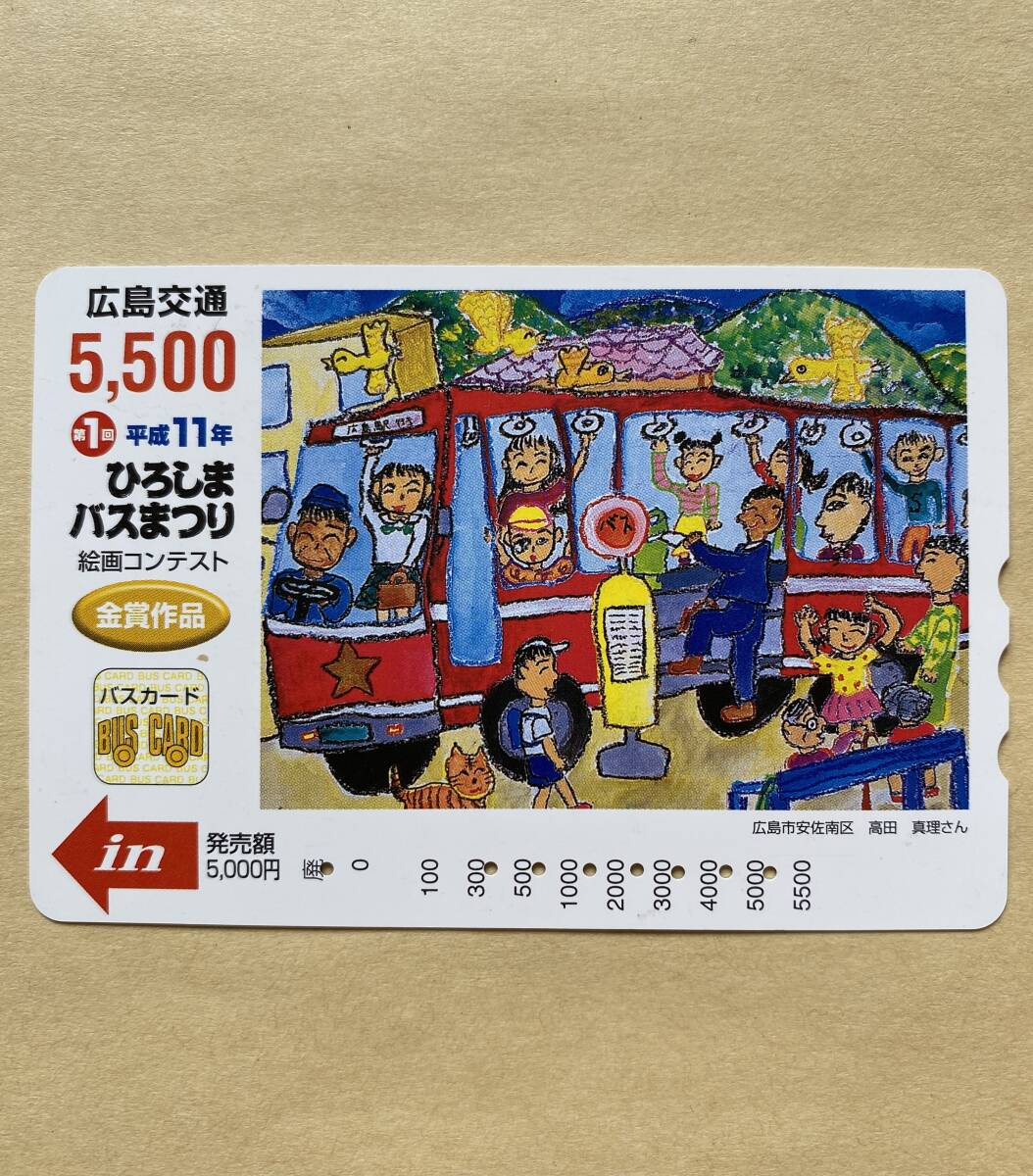 - 【使用済】 バスカード 広島交通 第1回 平成11年 ひろしまバスまつり 絵画コンテスト 金賞作品
