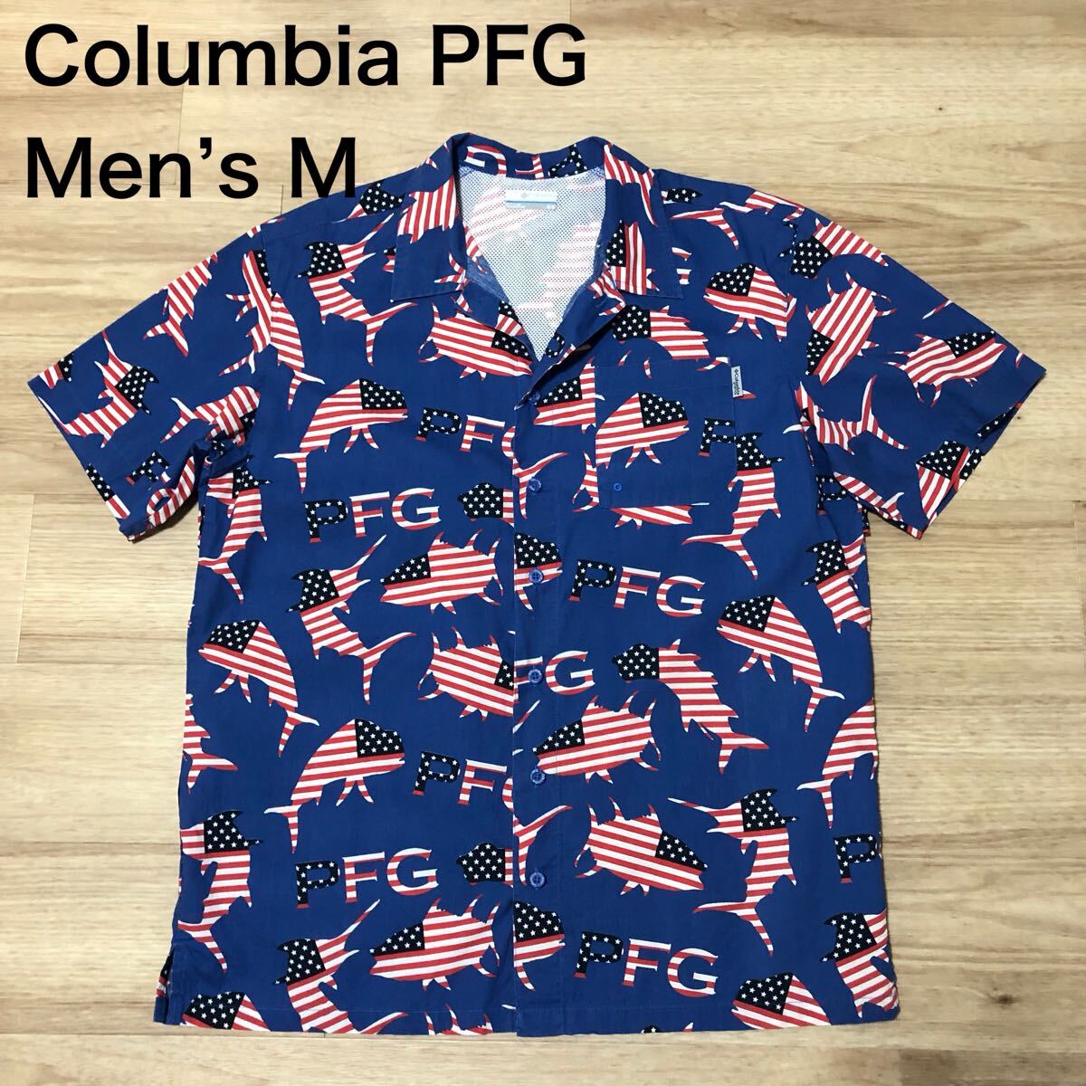 - 【送料無料】Columbia PFG半袖シャツ 青星条旗総柄 メンズMサイズ コロンビアフィッシングシャツアウトドアシャツ登山釣り