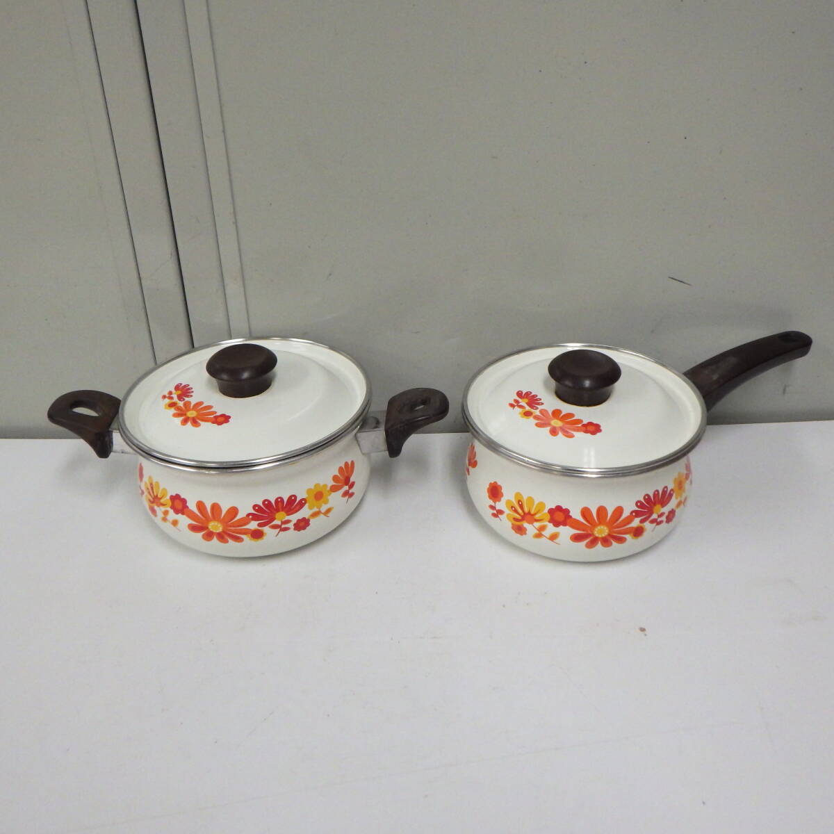 - 昭和 レトロ ポップ アンティーク 鍋 花柄 ホーロー 琺瑯 2点セット