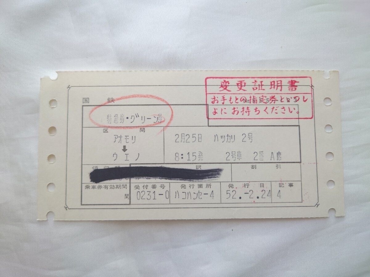 - ◎国鉄◎青森→上野 はつかり2号特急券グリーン券◎マルス券 変更証明書スタンプ押印