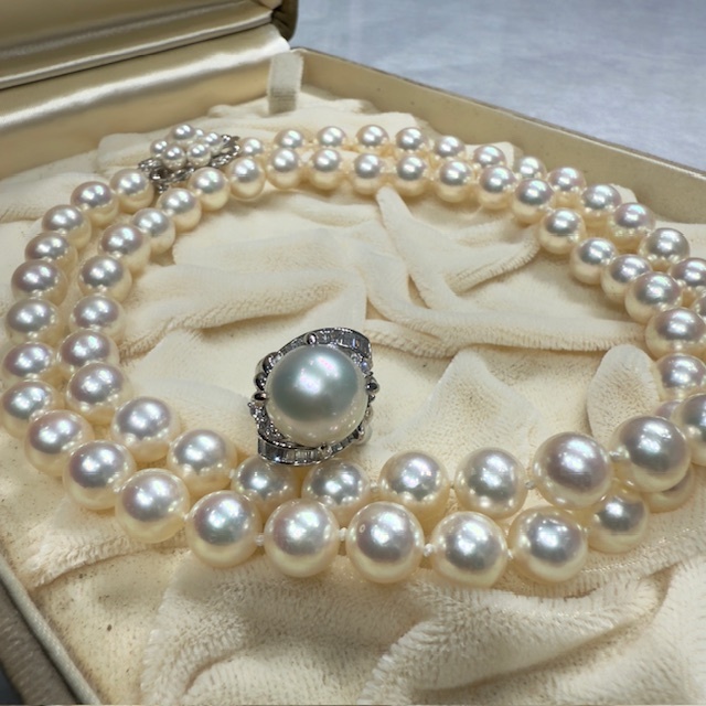 - ●H7-7-80 アコヤ真珠 9㎜ パールネックレス K14WG 本真珠 12.25㎜ プラチナリング ダイヤ0.58ct ネックレス リングセット