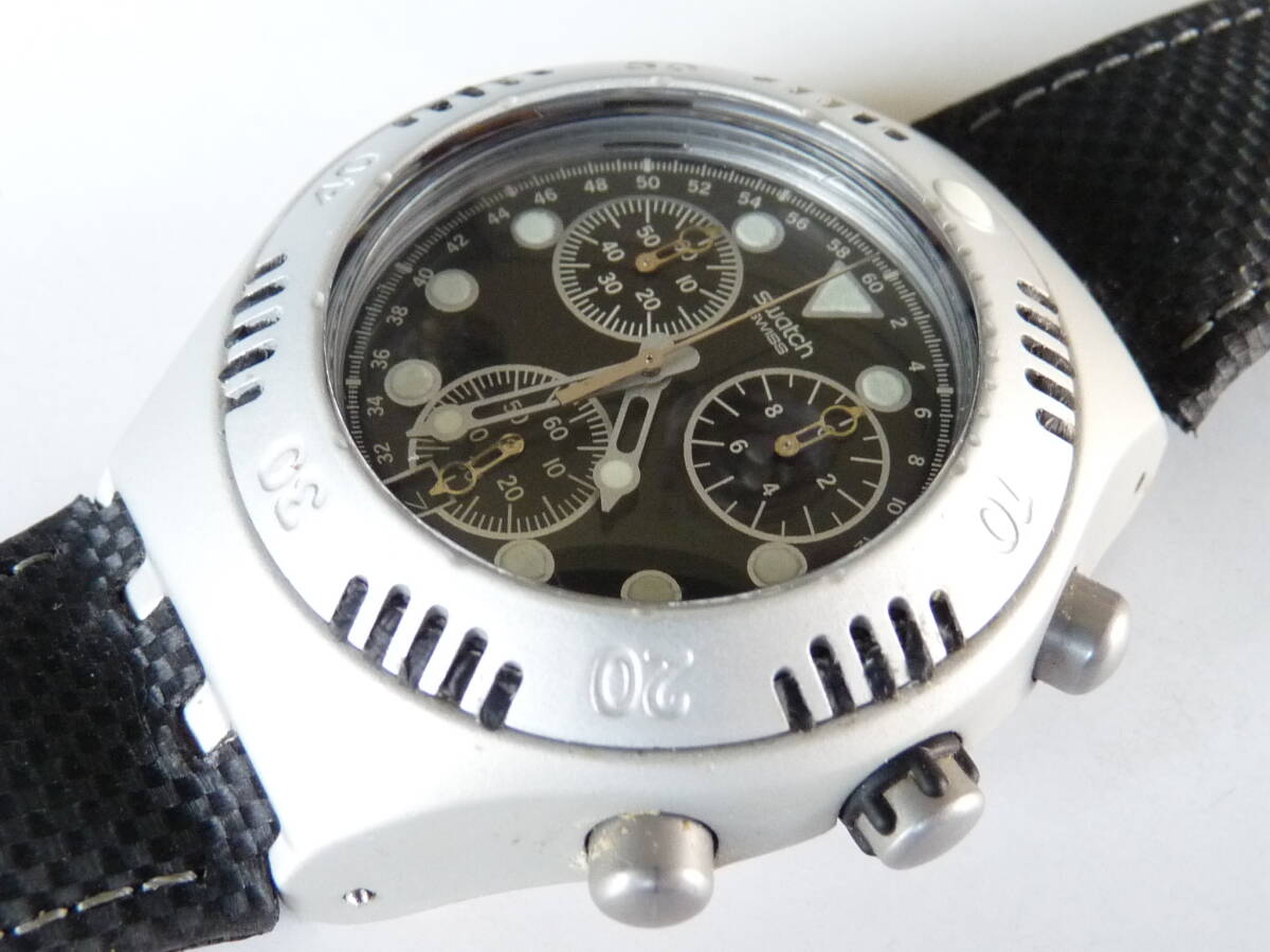 > 極短期使用 電池取替稼働中 良品 2000年モデル スウォッチ Swatch Irony Scuba 200 Chrono Black Russian 品番YBS4000 6時方向に日付表示有
