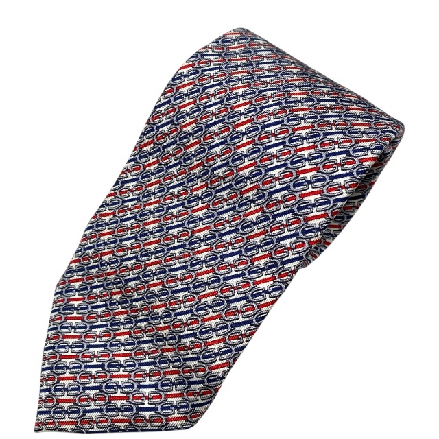- GUCCI グッチ ネクタイ ホースビット ストライプ 総柄 ロゴ シルク ホワイト ネイビー レッド