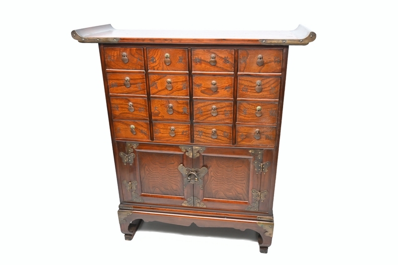 - 李朝 薬箪笥 ■ 李朝家具 [横約60㎝ × h約67.8cm] 16引出し 観音開き■ 美品 天然木 アジア箪笥 扱い易いサイズ ■
