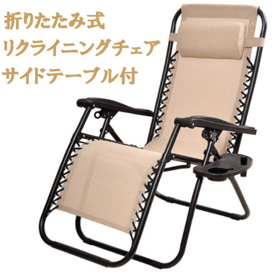 - 【送料無料】折りたたみ式 リクライニングチェア ★サイトテーブル付 椅子 キャンプ BBQ アウトドア レジャーに 耐荷重149Kg ベージュ