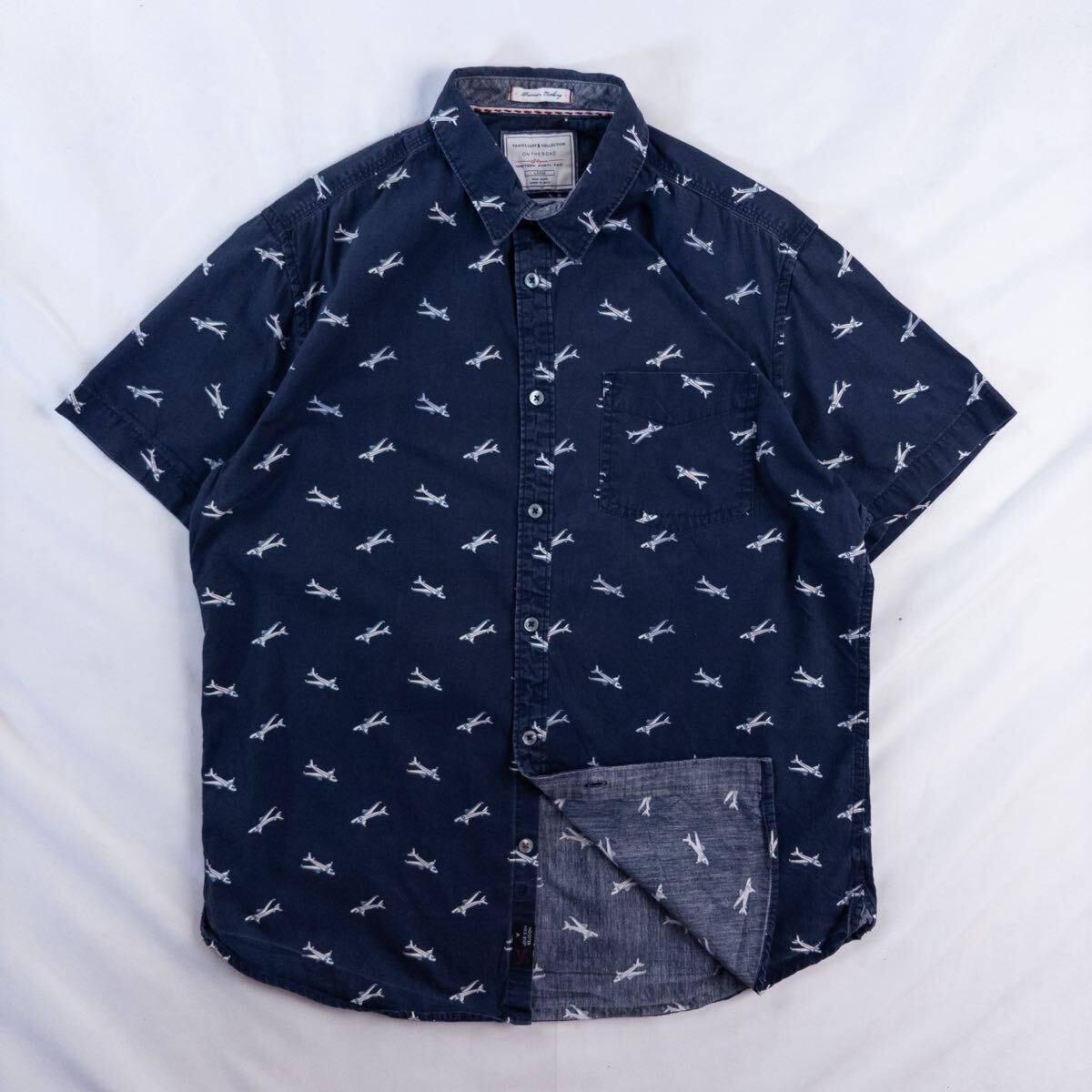 > US Vintage 00s ON THE ROAD Slim Fit コットン100% 飛行機 ポップ イラスト 乗り物 ネイビー 紺 総柄 デザインシャツ