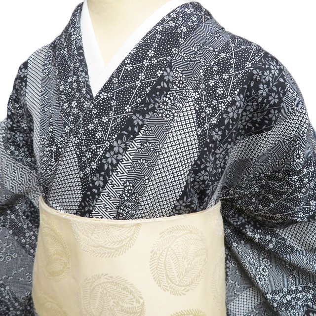 > 小紋 江戸小紋 着物 未使用 正絹 袷 カジュアル 紗綾形 花模様 黒色 身丈157cm 裄66cm M きもの北條 A1238-3