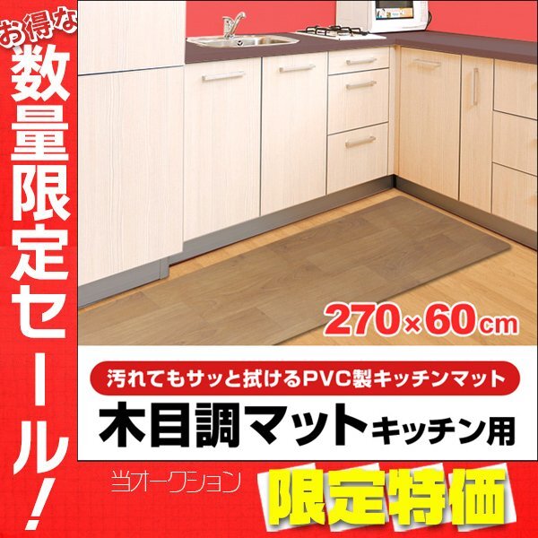 > 【限定セール】木目調 キッチンマット 拭ける 270×60cm 防水 撥水 滑り止め ビニール 台所 おしゃれ PVC フローリング 傷防止 床暖房