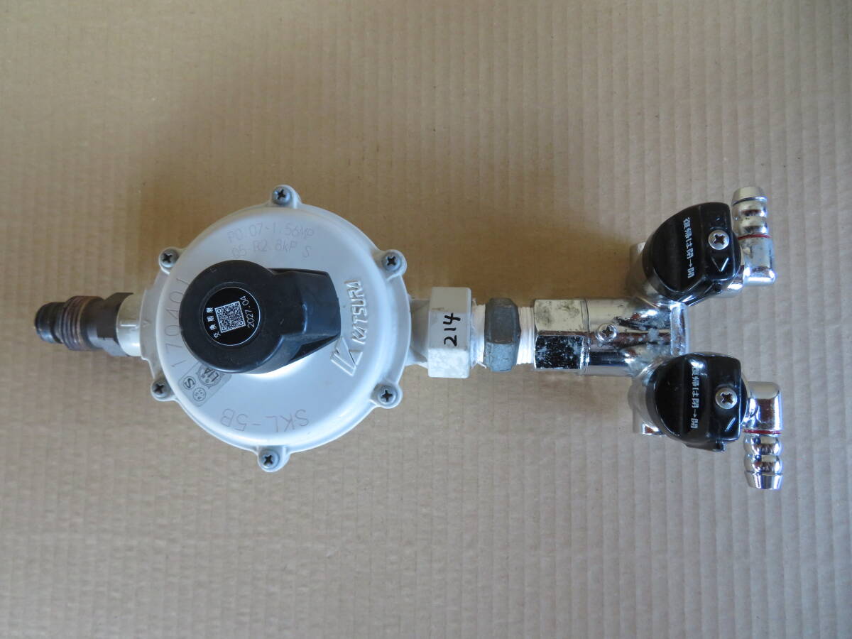 > レギュレーター#214 調整器 2口コック訳あり LPガス 中古品 LPG 点検チェック済 458 BBQ キャンプ 07/07/18