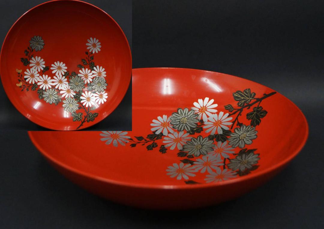 - 【芸】木製朱塗 金銀蒔絵『菊花文』丸鉢 盛鉢 菓子鉢 菓子器 飾り鉢 / 茶事 懐石道具 時代物☆A0807