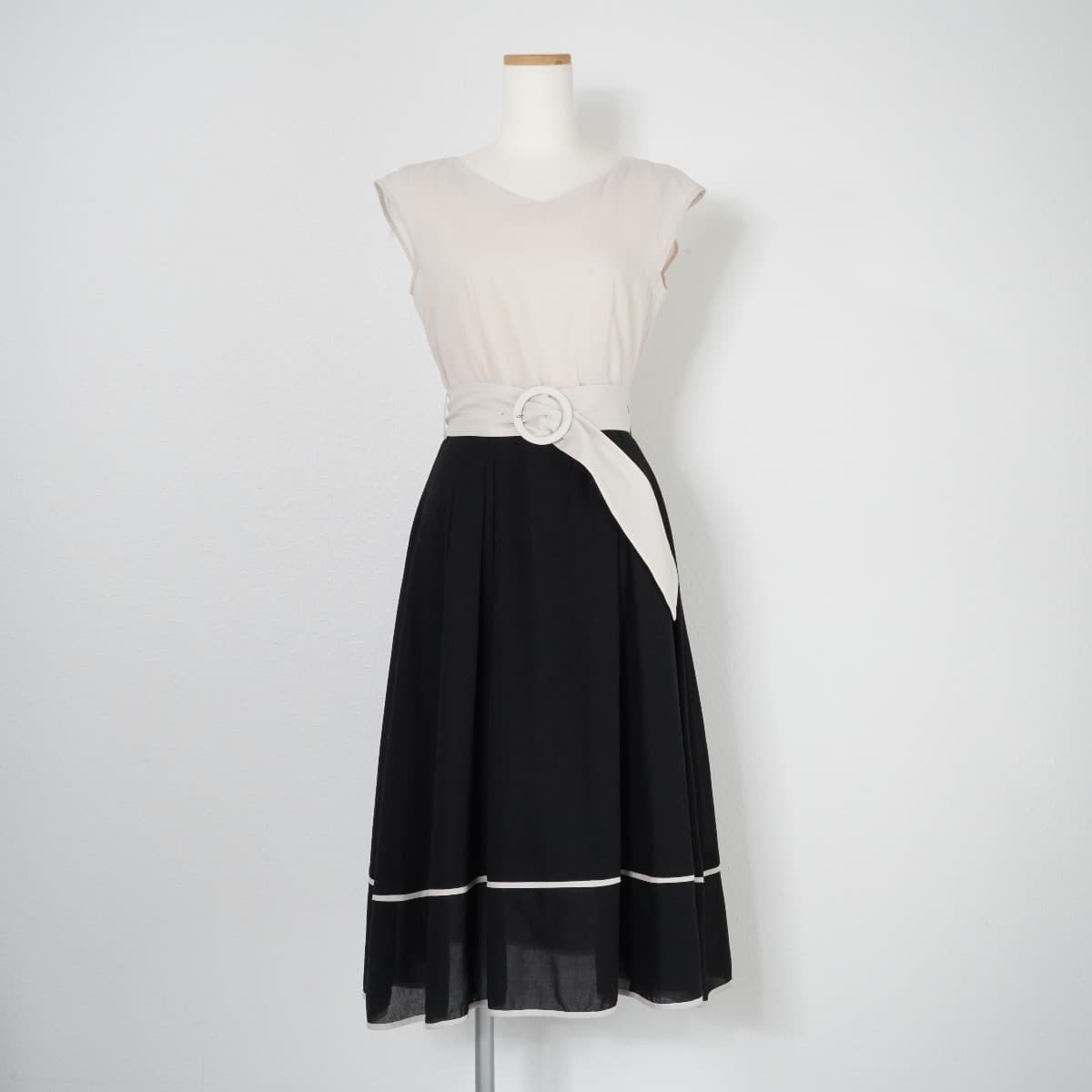 - JUSGLITTY ジャスグリッティー ベルト付きワンピース ワンピース 切替バイカラー フレアロング フレンチスリーブ ベルト ベージュ黒