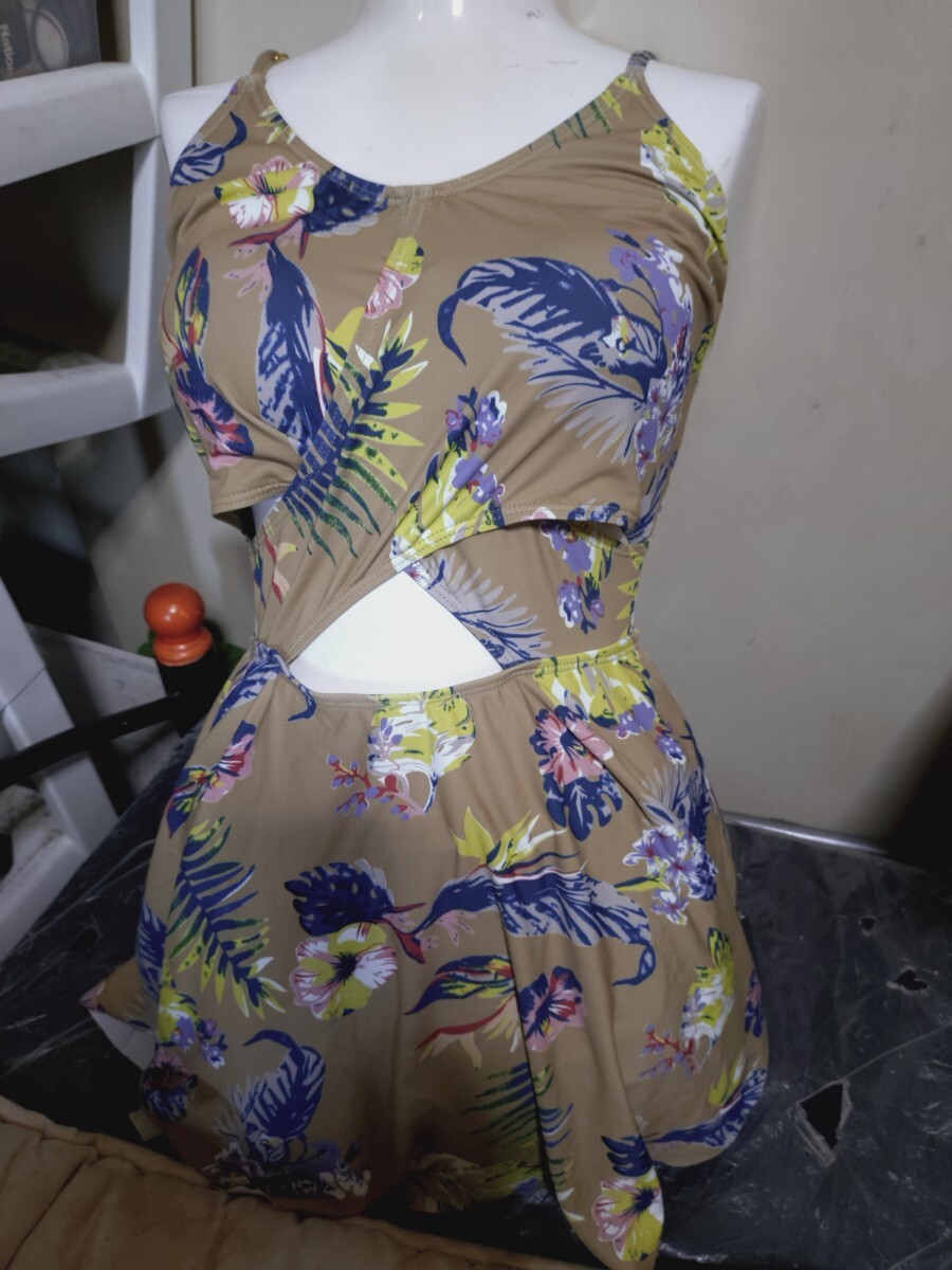 - M4345◆洋服感覚◆スカートパンツ◆セレブなブラウン系花柄ワンピース水着◆9М