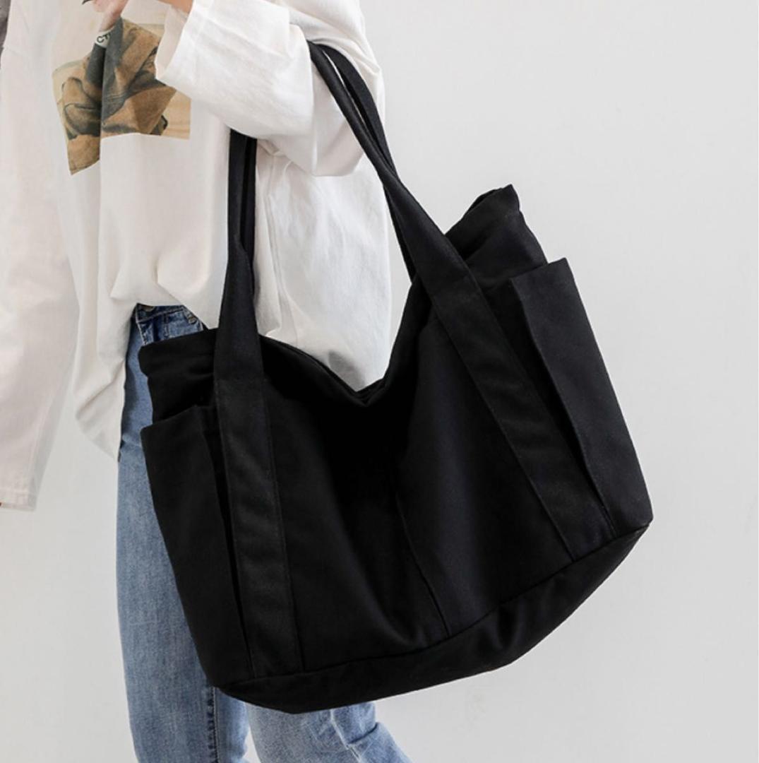 - 韓国風 トートバッグ ブラック 帆布 大容量 キャンバスバッグ 通勤 通学 ブラック プチプラ マザーズバッグ