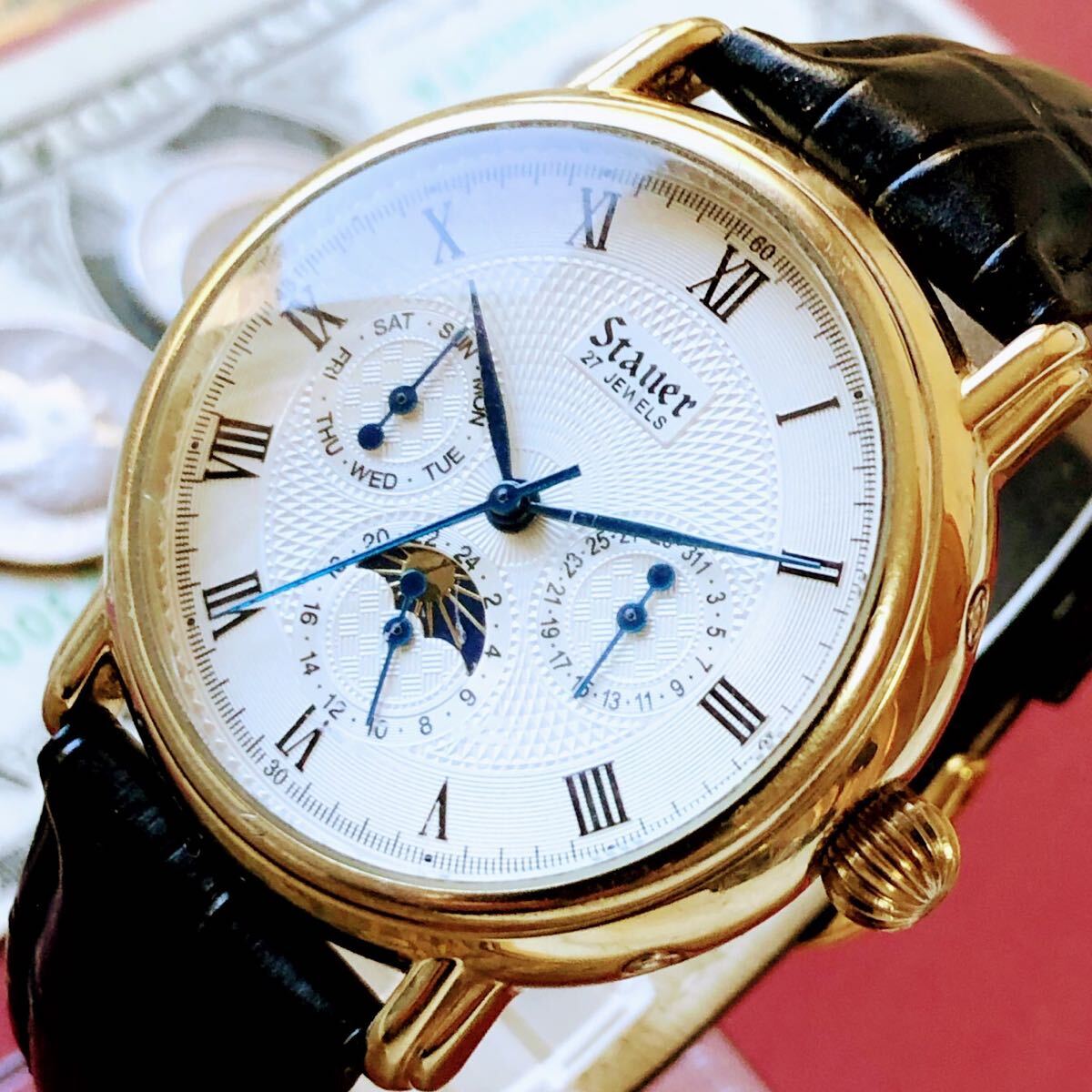 - #3686【人気のムーンフェイズ】メンズ 腕時計 Stauer スタウラー 動作品 27石 アンティーク ヴィンテージ 自動巻き 機械式 ローマ数字 美品