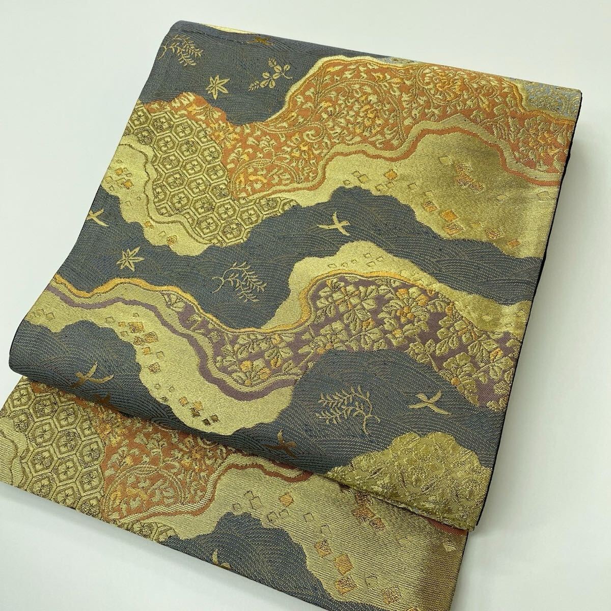 > 袋帯 名物裂 金彩 亀甲に花唐草 正絹 W-2881