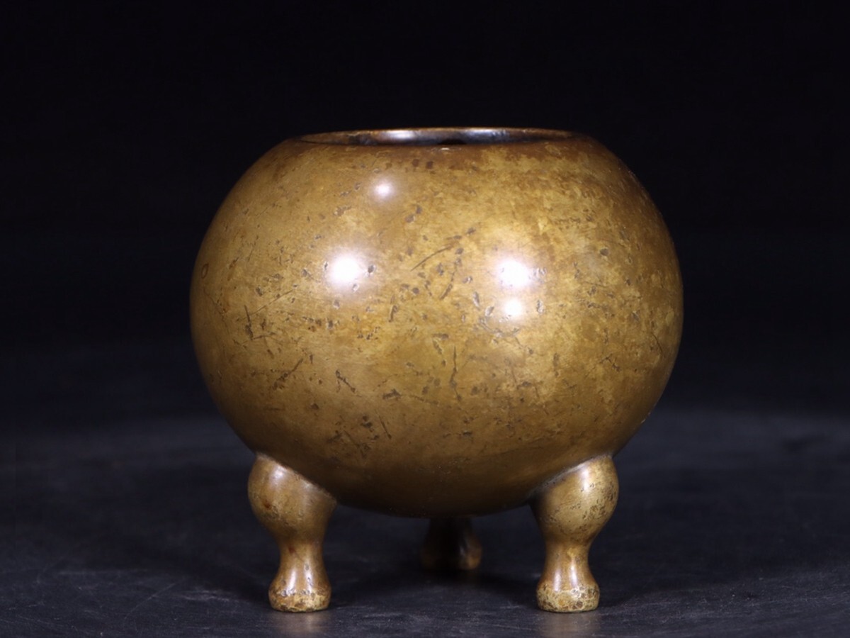 - 「明代 宣徳 古銅彫 球式 三足老銅香炉」旧銅器 置物擺件 賞物 中国古美術 旧蔵出