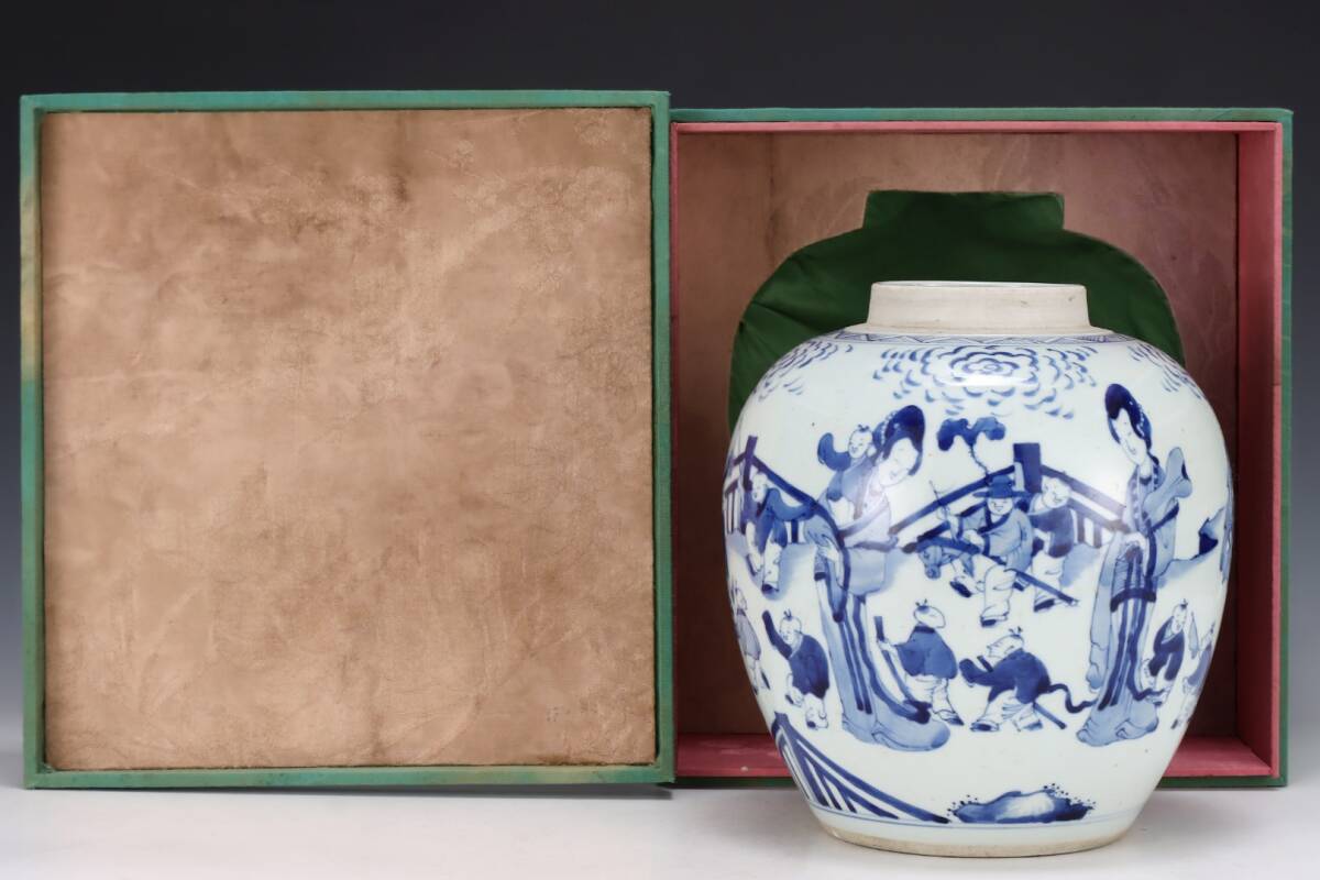 > 旧蔵 清 康熙年製 青花 貴妃教子図紋缶 陶芸 古陶磁器 中国磁器 極細工 中国古玩 骨董品 古美味 207