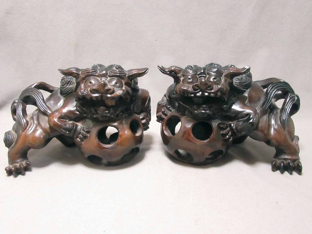 - 置物:木彫「獅子(一対)」サイズ:250mm×130mm×高さ180mm/250704★