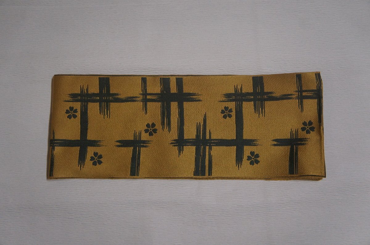 - 化繊梅谷渋色十字絣調桜花模様リバーシブル半巾帯[N16333]